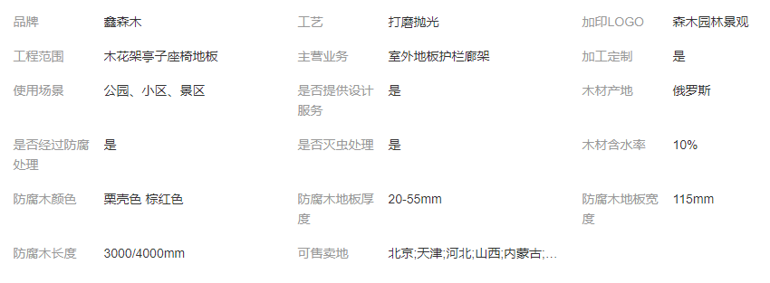 防腐木地板,是將木材經(jīng)過(guò)特殊防腐處理后,得到的具有防腐爛、防白蟻、防真菌的功效的地板。專門(mén)用于戶外環(huán)境的露天木地板,并且可以直接用于與水體、土壤接觸的環(huán)境中,是戶外木地板、園林景觀地板、戶外木平臺(tái)、露臺(tái)地板、戶外木棧道及其他室外防腐木涼棚的首選材料。